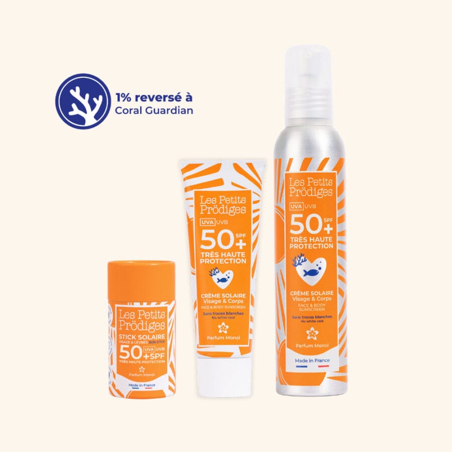 - Composition : Filtres solaires organiques modernes, à l’impact moindre sur les coraux par rapport aux autres crèmes solaires sur le marché. Les Petits Prödiges reversent 1% de leur chiffre d’affaires à l’association Coral Guardian. Enrichie à l’aloe vera, aux probiotiques et à la provitamine B5 pour apaiser et hydrater,