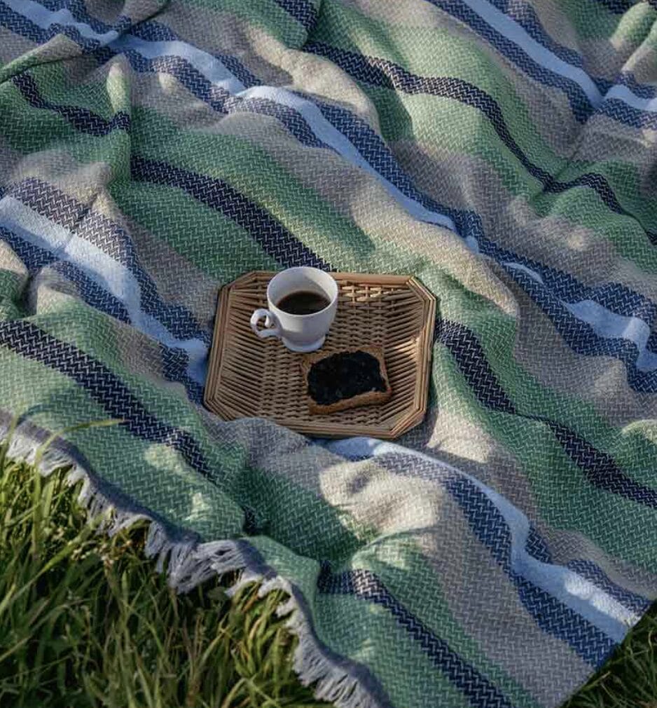 Dès le premier regard, son design à rayures vertes, bleues et naturelles crée une atmosphère apaisante et lumineuse. Cette harmonie de couleurs rappelle les plages italiennes et l’art de vivre estival, entre nature et détente. Posée sur le sable, un transat ou une terrasse, elle apporte immédiatement une touche raffinée et intemporelle.
