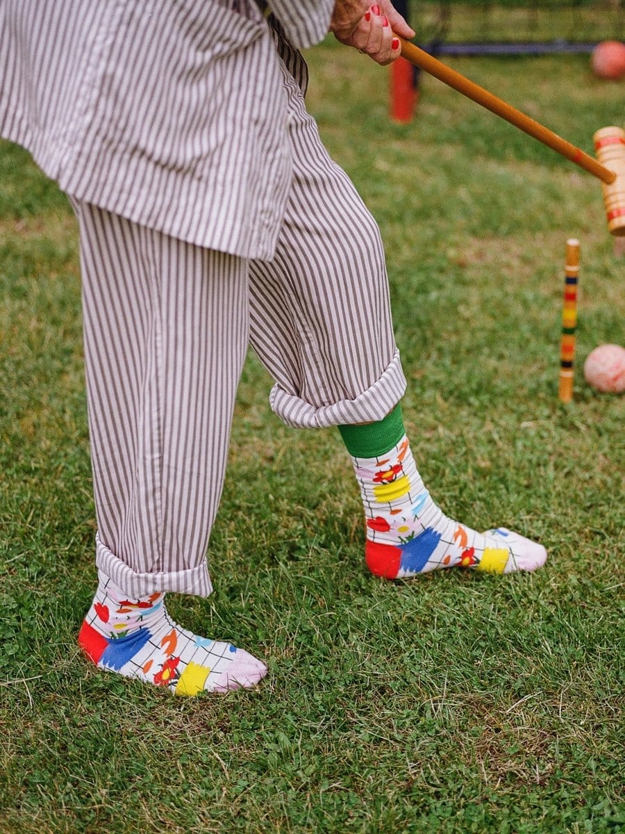 Le motif associe des fleurs colorées à une grille graphique, créant un équilibre unique entre nature et design. Ces chaussettes se démarquent tout en restant faciles à porter au quotidien, que ce soit avec un look casual ou plus affirmé.