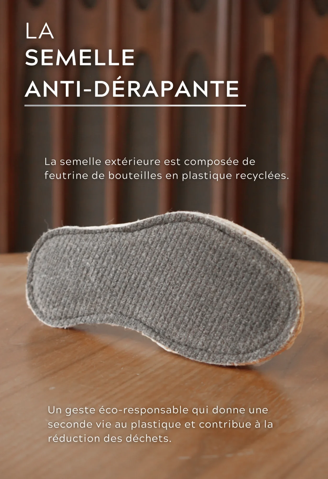 ✓ Adopter les Pantoufles SIMONE – Caussün c’est s’envelopper dans un cocon douillet et réconfortant. Sa composition majoritairement composée de laine, sa talonnette molletonnée et sa doublure intérieure en coton bio vous tiendront bien au chaud tout l’hiver.