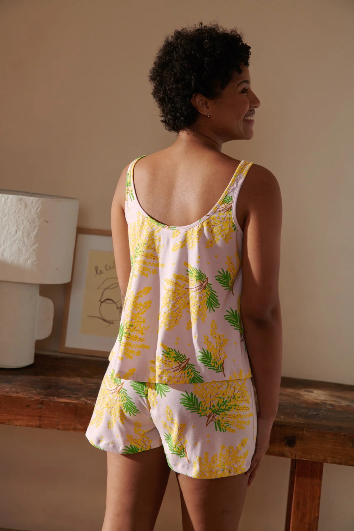 Le Pyjama Débardeur Coton bio Mimosa – We Are Jolies privilégie avant tout votre liberté de mouvement. En effet, sa coupe évasée et ses fines bretelles permettent de bouger sans contrainte durant votre sommeil. Grâce à sa taille élastiquée, le short s’ajuste parfaitement à votre silhouette tout en restant très souple. De plus, son motif floral jaune apporte une touche de gaieté à votre vestiaire de nuit. Ainsi, vous profitez d’une sensation de légèreté incomparable du soir jusqu’au matin.